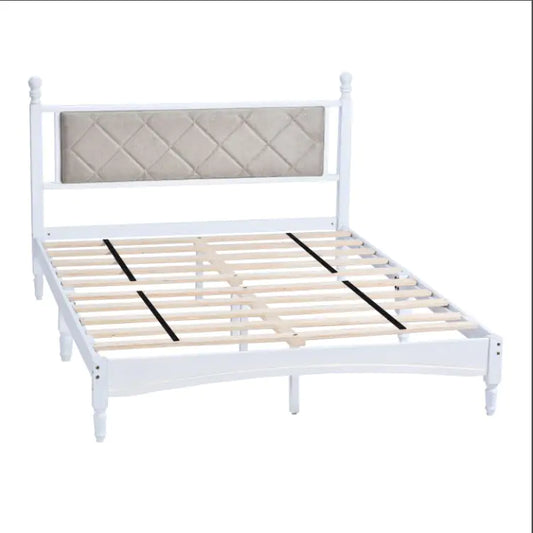 Wooden Bed Frame With Fabric Headboard, Solid Rubberwood With Wooden Central Support